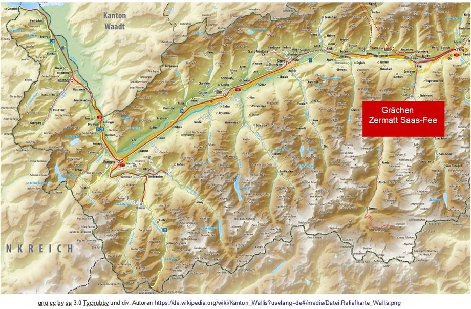 Die Ski Gebiet Karte passen wir bald an. Die Skikarte zeigt die 2 bekannten Skigebiete Zermatt und Saas-Fee. Dies sind wesentlich schlechter aus dem Mittelland zu erreichen als die Lauchernalp. Wir epfehlen für Skifahren mit Zug ab dem Mittelland das Lötschental und für Skiurlaub Sass-Grund.
